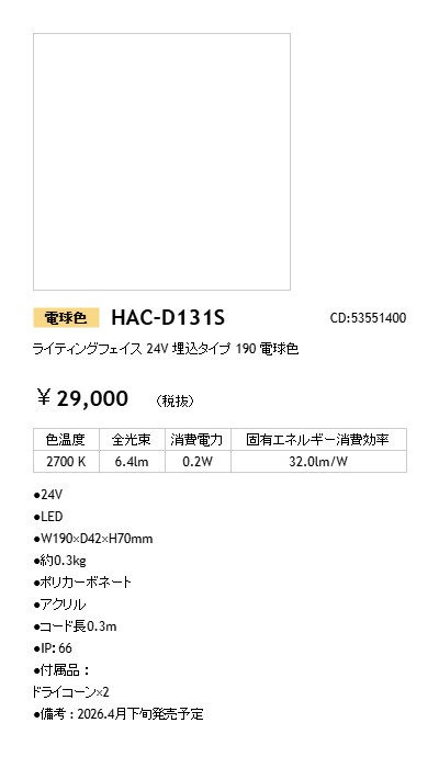 ライティングフェイス 24V 埋込タイプ 190 電球色